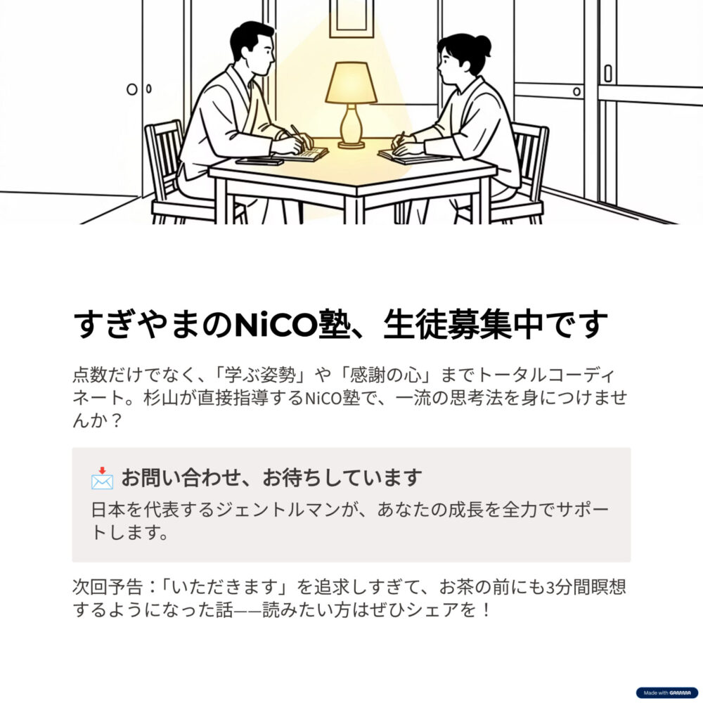 目に見える点数だけでなく、目に見えない「学ぶ姿勢」や「感謝の心」までトータルコーディネート。そんな日本を代表するジェントルマン・杉山が直接指導するNiCO塾で、一流の思考法を身につけませんか?お問い合わせ、待ってます。