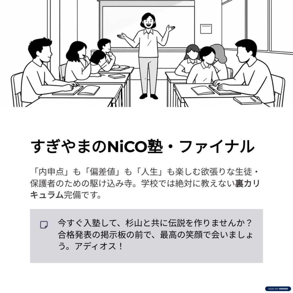 キミたちがこの「内申点ゲーム」を攻略し、通知表という名のパスポートを手に入れ、広い世界へと羽ばたいていくことを、杉山は心から願ってやみません。