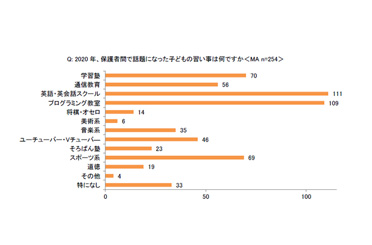 「2020年、保護者間で話題になった子どもの習い事は何ですか<MA>」という問では、「英語・英会話スクール」につぎ「プログラミング教室」が上がりました。2020年度の教育改革によって、実際にプログラミングの学習が公教育で実施されたことで注目が集まったと考えられます。オンラインやテレワークが浸透したことによって、どこにいても世界と渡り合えるようなスキルを養える習い事への関心度が高まっていることが伺えます。